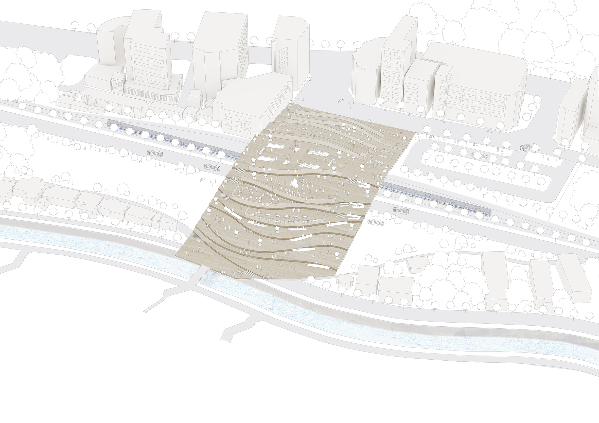 水と緑の豊かな自然環境に恵まれ、多世代の住民がバランス良く住む鶴川の街に、それらをつなぐひろばを提案しました。現在の鶴川駅には南北をつなぐ通路がないため、駅舎が街を南北に分断するように建っています。駅前は北と南で様子が異なり、北側は都市機能(商業施設や公共施設)が集積しているのに対し、南側は自然(川、緑地)に囲まれた長閑な風景が広がっています。街の北と南を大きくつなぐ「鶴川ひろば」は、駅の利便性を高めると共に、鶴川の新しいランドスケープを創出します。ひろばは奥行きの異なるコンターが段状に連なった形をしており、そこに生まれる様々な大きさのスペースは、利用者に多様な使い方を促します。また段状の形は視界に変化をもたらし、各レベルから鶴川の色んな景色を楽しめるように計画しました。ひろばの頂上にある駅の改札を出ると、鶴川の街をぐるっと一望できます。ひろばの北側には周辺の商業施設を補填するような店舗を、ひろばの南側にはイベントスペースなど、公共的で文化的な施設を配置します。いずれも屋外と屋内が入り混じった、外のような中のような空間を連続させます。開放的な大空間は、駅への通過動線としてだけではなく、人々が思い思いに好きな場所で過ごすひろばとなります。カフェでコーヒーを飲んだり、散歩しながらスペースとスペースを渡り歩いたり、気持ちの良いテラスで植物を眺めながらお弁当を食べたり、生演奏を聴いたり、鶴見川まで伸びるひろばで水辺空間を楽しんだり、このようなアクティビティが生まれる「鶴川ひろば」は、みんなのひろばとして、人々の生活の拠点、コミュニティや憩いの場となります。