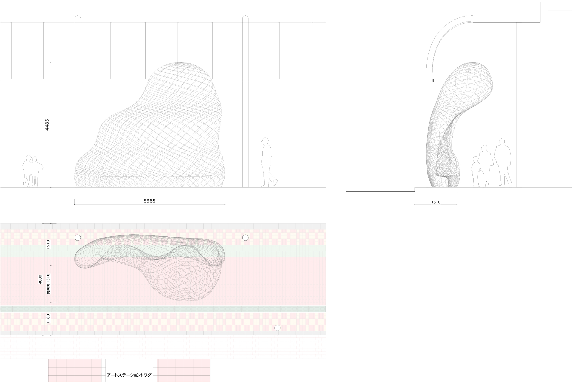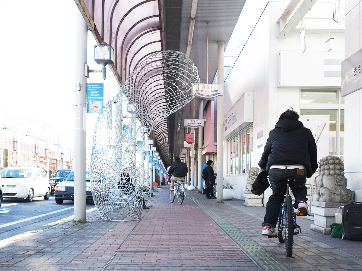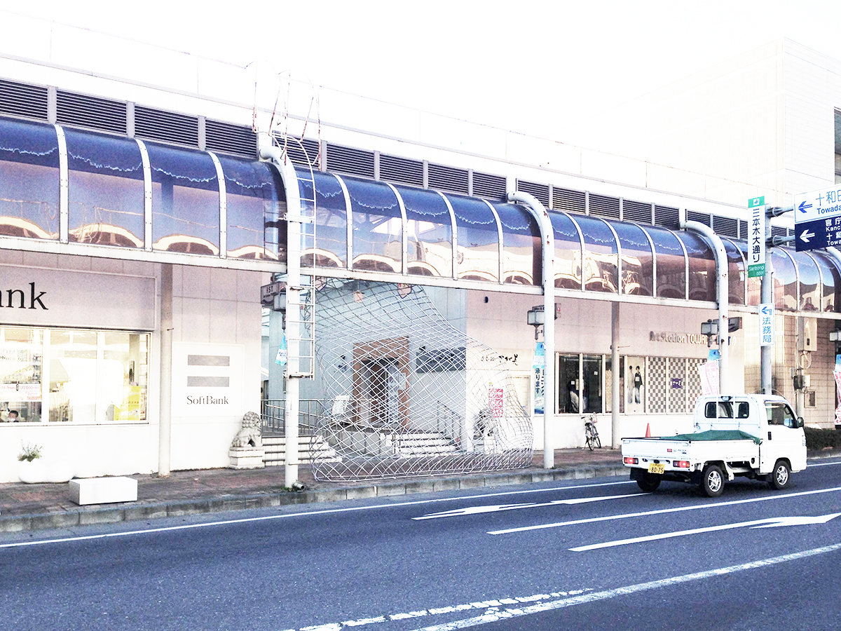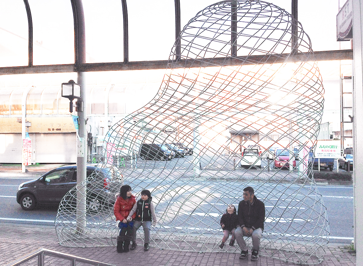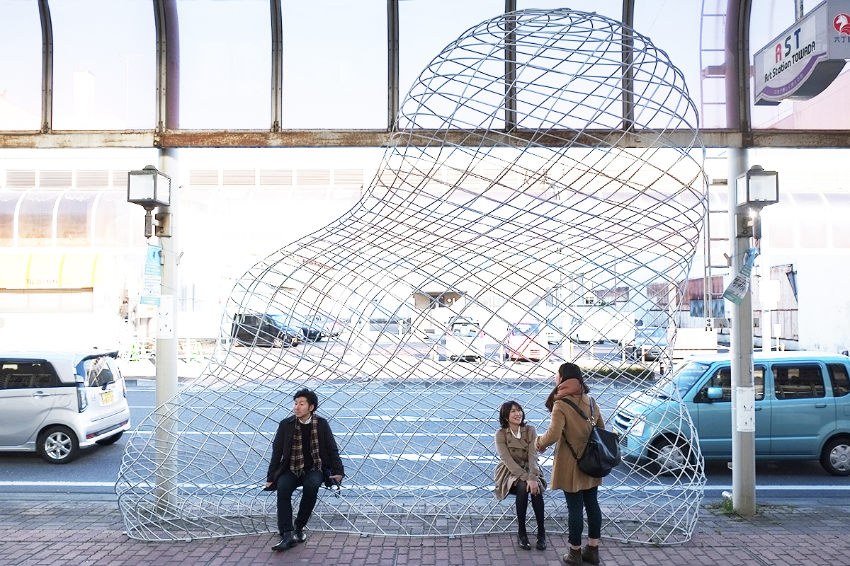 青森県十和田市のアートによるまちづくり事業の一環で、人通りの少なくなった商店街に、市民や観光客を呼び込む仕掛けとしてアートファニチャーを提案しました。十和田市はこれからのまちづくりとして、商店街の使われなくなった場所に新たな用途、交流施設など、人々に使われる公共スペースを付加したり、近くの美術館などから人の流れを商店街に促す仕掛けを街に施すなど、街の回遊性を生み出す新しいまちづくりに取り組んでいました。最初に商店街を訪れた時に、まず目に付く、昔ながらのシンボリックなアーケードを見て、この力強い構造物は、空き店舗が多く活気を失った商店街には不釣り合いだと感じましたが、既存の商店街の骨格は活かしつつ、そこに新たなプログラムを取り入れながら、引き続き街の歴史を積み重ねようと動き出している商店街を知り、堅牢なアーケードとこれからの商店街をやわらかくつなぐファニチャーを提案したいと考えました。メッシュ構造により立ち上げた透明感のあるボリュームは、普段は商店街の風景に溶け込んでいますが、ベンチとして使われる時には、そこに一つの公共空間が立ち現れます。今後、多角的に展開していく商店街に対し、アーケードと共に、人々の活動を見守る背景のように存在できたらと考えました。