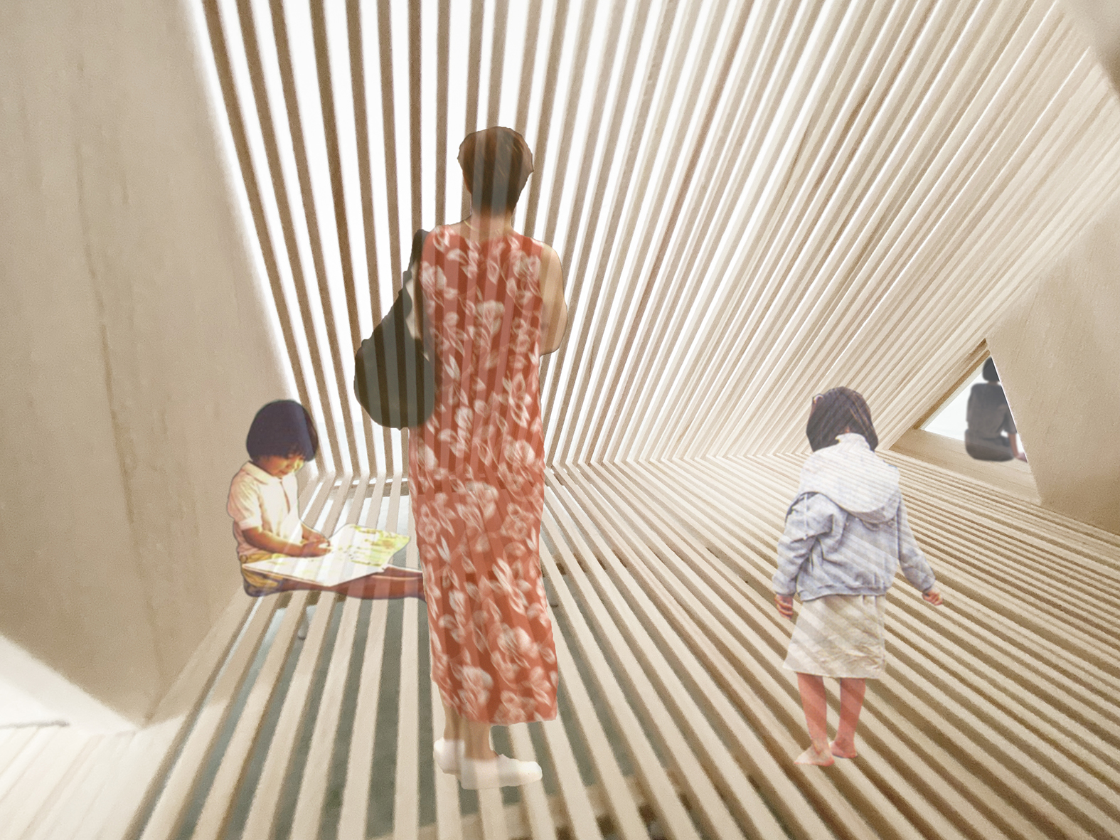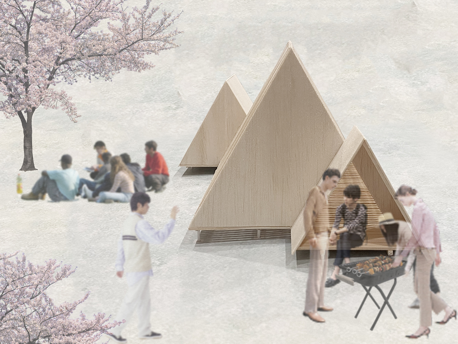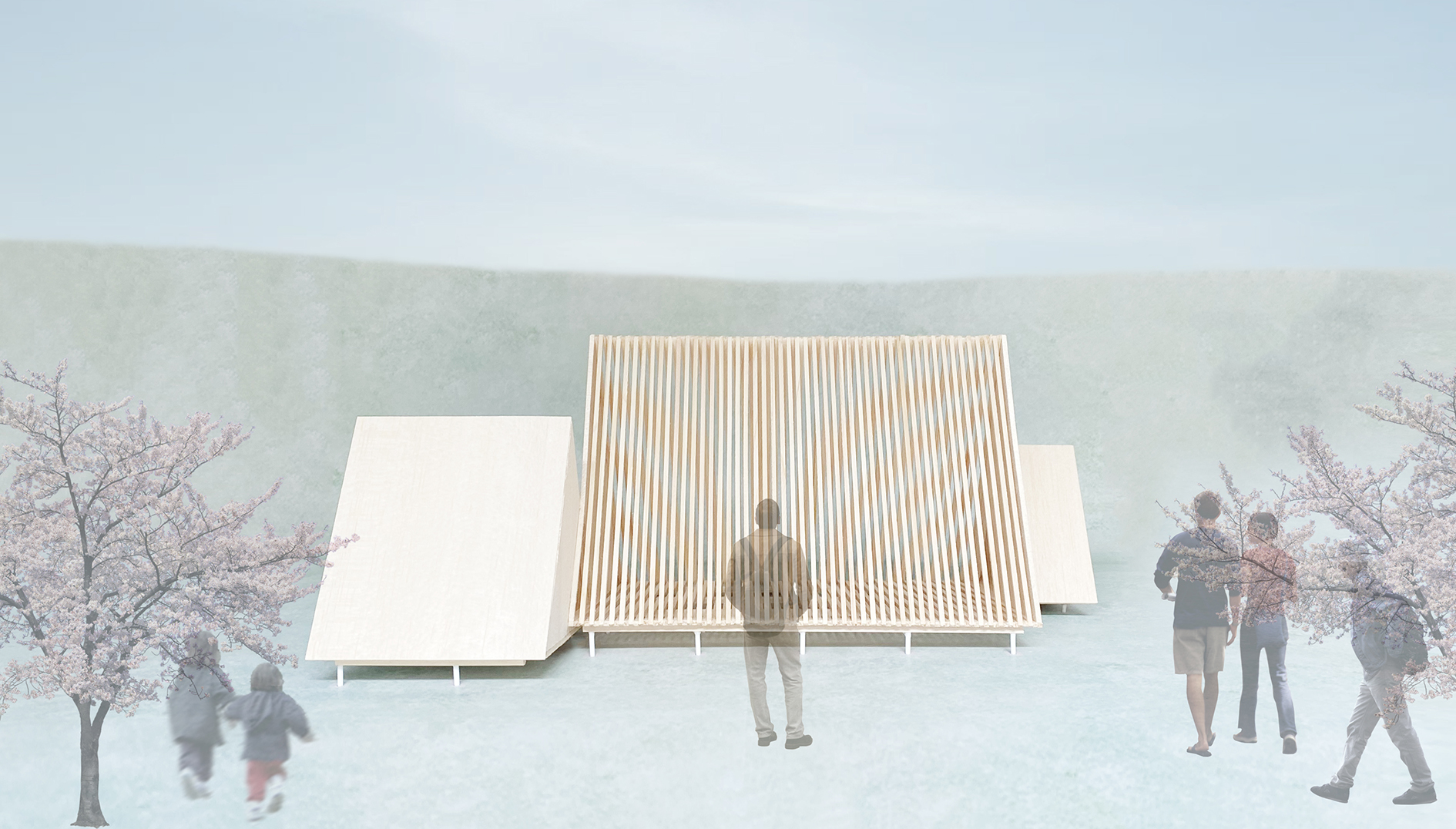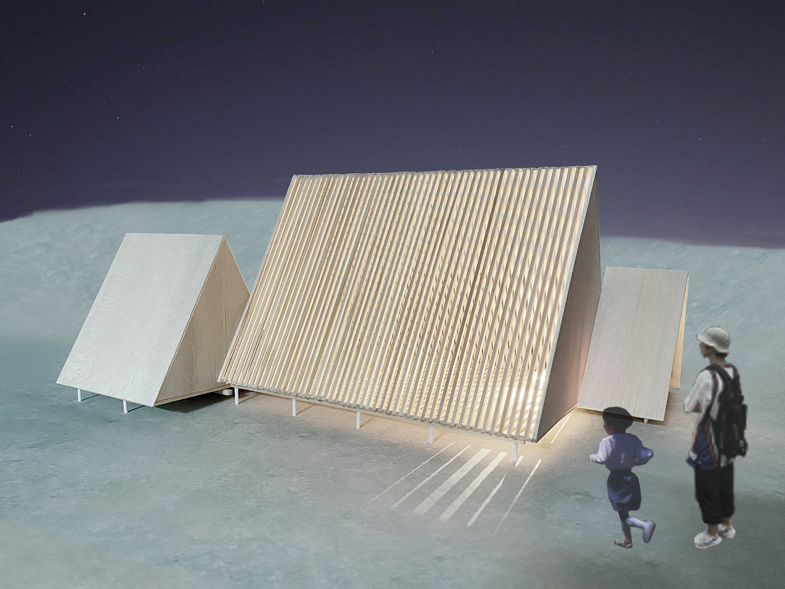 女川町海岸広場に、人が自由に使い方を創造しながら楽しむキャビンを提案しました。大小様々な三角形が連なるキャビンは、開口をベンチとして使ったり、中の色んな大きさの三角形の開口に合わせて身体を縮めたり、伸ばしたり、また中央のルーバー越しに、海や山からの柔らかい風を感じたり、差し込むやさしい陽の光にまどろんだりと、使い方によって様々な体験を生み出します。また、日没後、内部に明かりを灯せば大きなランタンになります。「海辺の三ツ山」は、女川町に広がる山並みを背景に、海岸広場に新しいアクティビティを誘発するキャビンです。