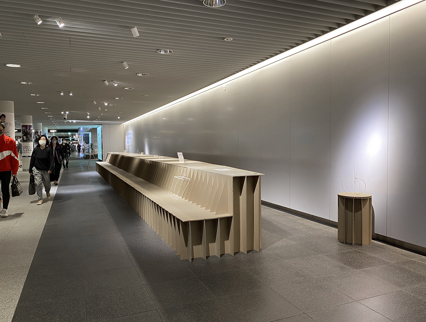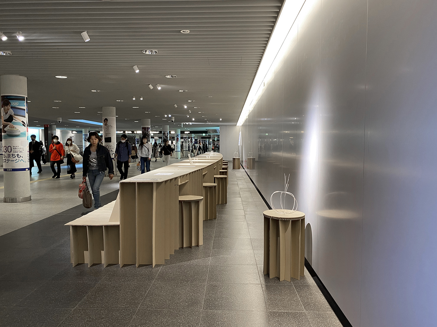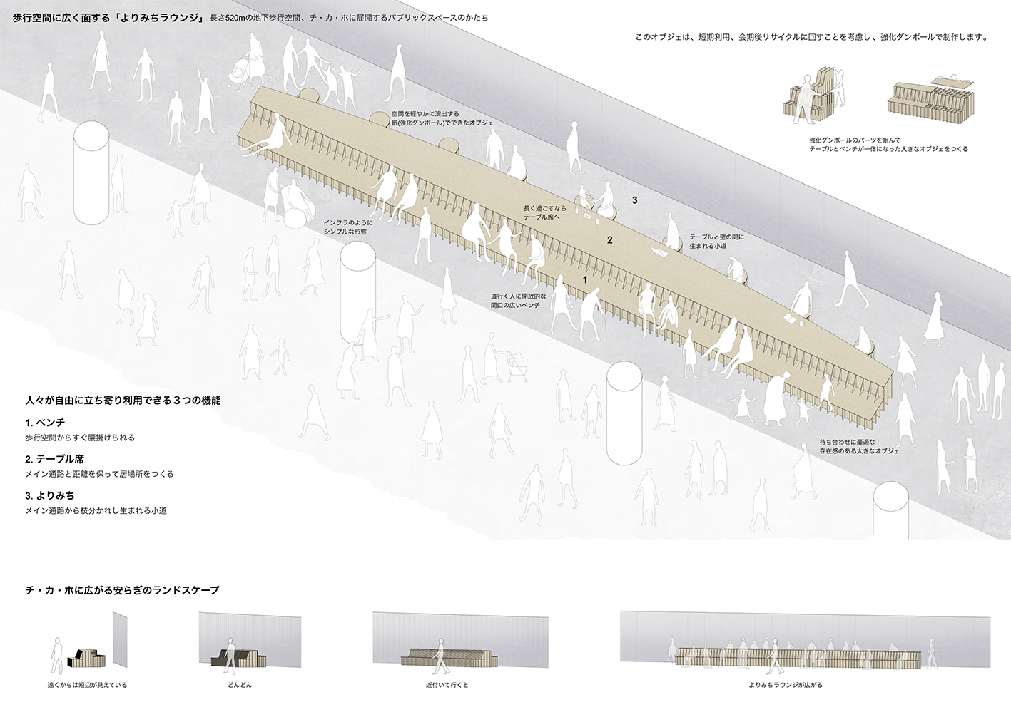 札幌駅前通り地下歩行空間に展開するパブリックスペースのかたちとして、歩行空間に広く面する「よりみちラウンジ」を提案しました。テーブルとベンチが一体になった大きなオブジェは、人々が自由に立ち寄り利用できる、以下3つの機能を持ちます。1, 歩行空間からすぐに腰掛けられるベンチ、2, メイン通路と距離を保って居場所をつくるテーブル席、3, メイン通路から枝分かれし生まれる小道(よりみち)。以上3つの機能は、メイン通路から壁に向かって、視界を遮らない3つのレイヤーとなって構成され、その重なりは、地下空間に広がるラウンジとして、安らぎのランドスケープをつくります。このオブジェは、短期利用、会期後リサイクルに回すことを考慮し、強化ダンボールで制作しました。
