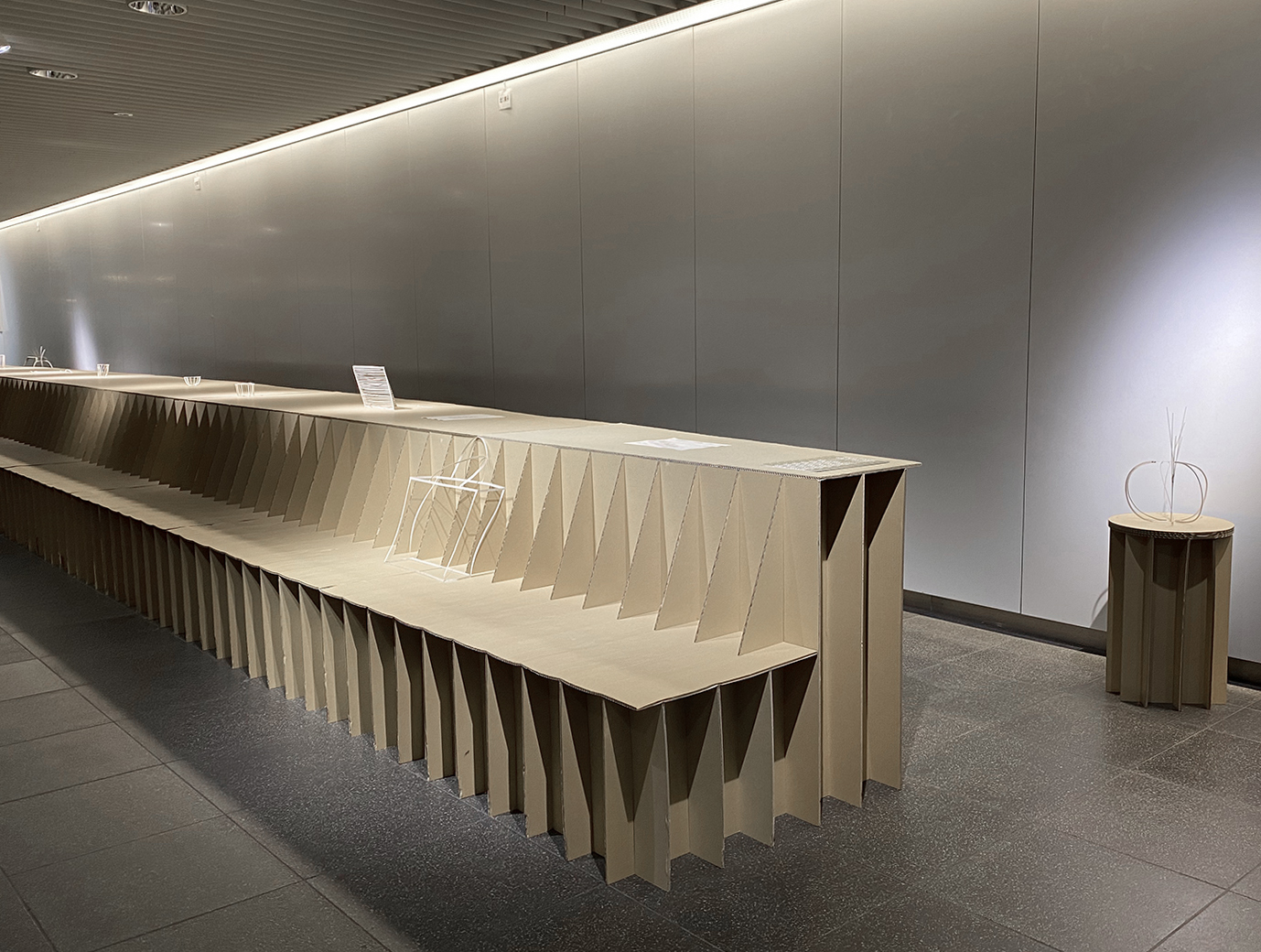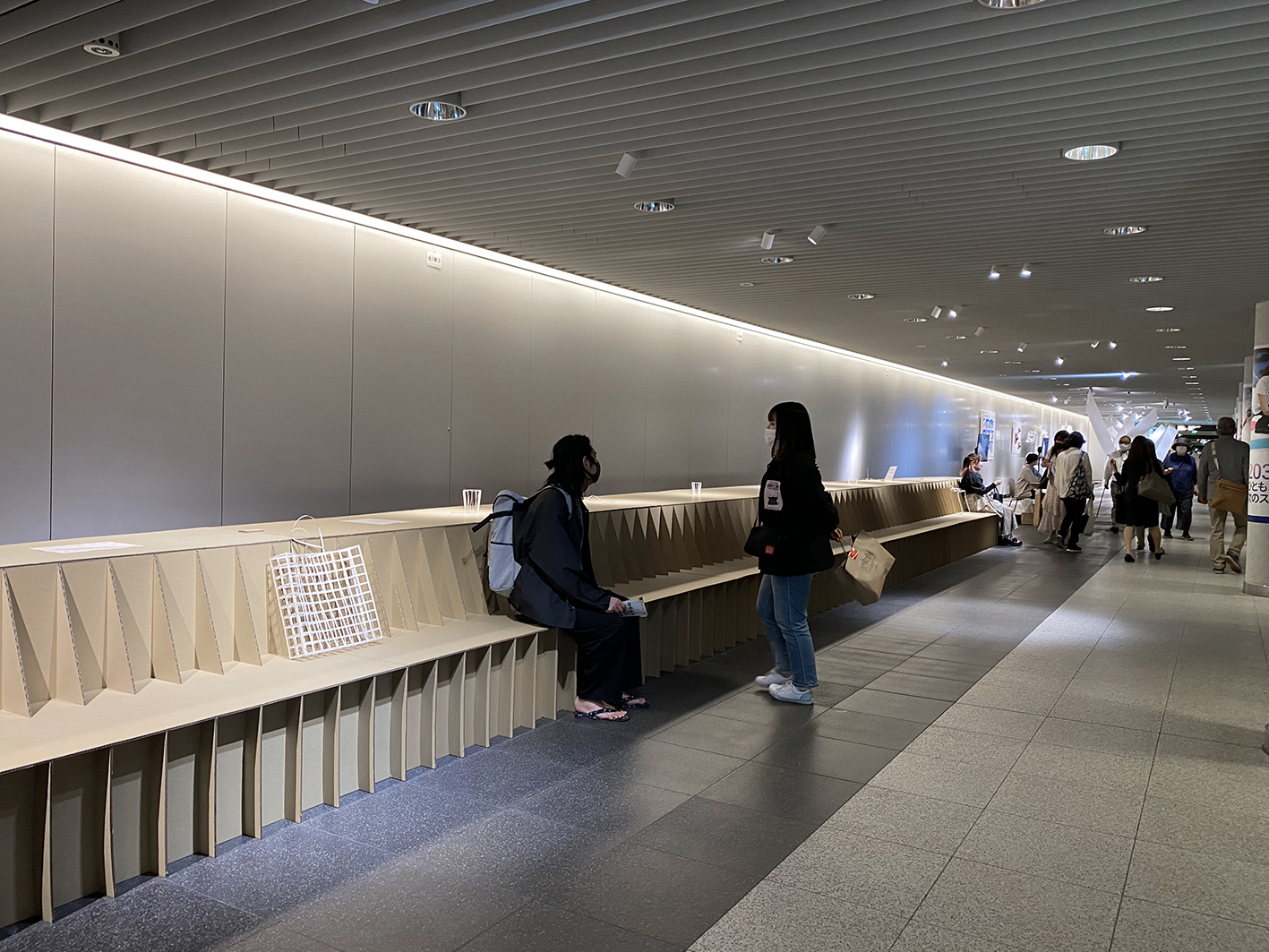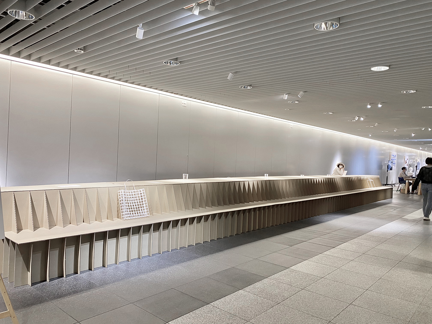 札幌駅前通り地下歩行空間に展開するパブリックスペースのかたちとして、歩行空間に広く面する「よりみちラウンジ」を提案しました。テーブルとベンチが一体になった大きなオブジェは、人々が自由に立ち寄り利用できる、以下3つの機能を持ちます。1, 歩行空間からすぐに腰掛けられるベンチ、2, メイン通路と距離を保って居場所をつくるテーブル席、3, メイン通路から枝分かれし生まれる小道(よりみち)。以上3つの機能は、メイン通路から壁に向かって、視界を遮らない3つのレイヤーとなって構成され、その重なりは、地下空間に広がるラウンジとして、安らぎのランドスケープをつくります。このオブジェは、短期利用、会期後リサイクルに回すことを考慮し、強化ダンボールで制作しました。