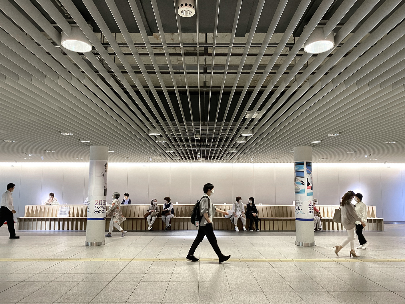 札幌駅前通り地下歩行空間は、四季を問わず快適な歩行空間を創出するために計画された、さっぽろ駅と大通駅を結ぶ長さ520mほどの地下通路です。メインの用途は移動のための歩行者通路ですが、通路としての機能のみならず、人々が留まることのできる広場や、歩行空間を尊重するように通りから距離を空けて道沿いに連なる店舗など、単なる歩行空間でも商業空間でもない、人々の振る舞いに寄り添った、有機的で流動的な都市空間となっています。「よりみちラウンジ」は、そのような都市的歩行空間に身体を委ねた時に、人々の振る舞いと場所から自然と生み出される形を目指して制作しました。終日、人々が行き交う歩行空間に、本流から枝分かれする支流をつくる。人々は歩くスピードを緩め、そこに「よりみち」できる。ちょっと休んでいく人、待ち合わせをする人、ノートパソコンを広げて仕事をする人。そしてしばらくしたらまた本流へ合流していく。その一連の流れを、地下空間にランドスケープとして浮かび上がらせる、装置としての「ラウンジ」を提案しました。
